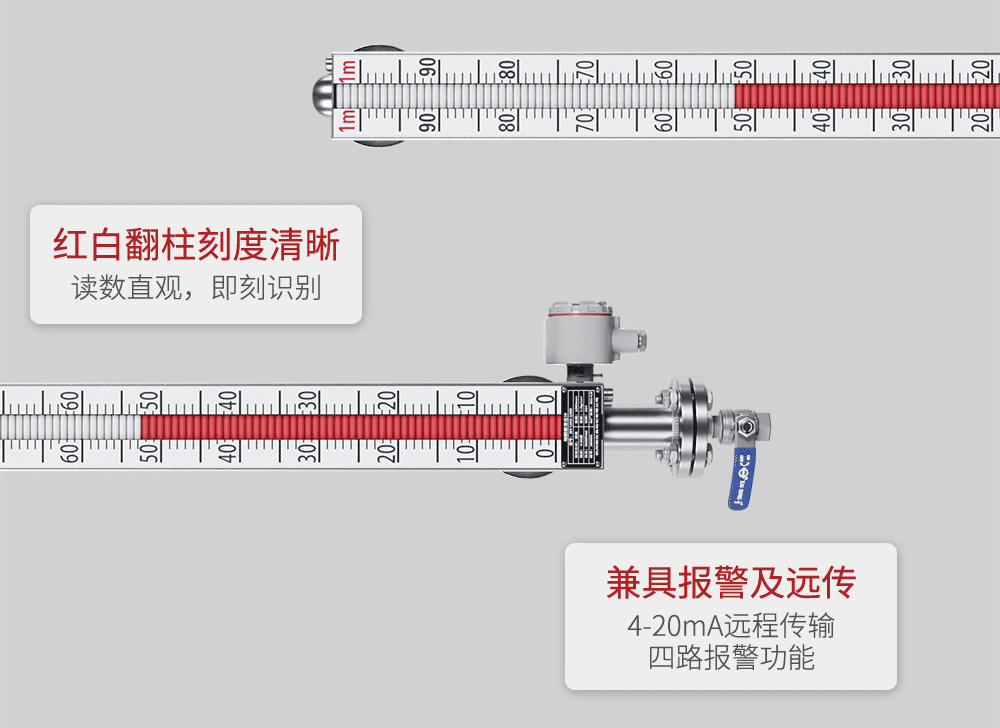 MIK-UZ磁翻板液位计根据浮力原理,浮子在测量筒内随液位的升降而上下移动,浮子内的永久磁钢通过磁耦合作用,驱动红白翻柱翻转 180°,液位上升时,翻柱由白色转为红色,下降时由红色转为白色,从而实现液位的指示。 具有耐腐蚀、稳定性强、易操作的特点,适用于低温到高温、真空到高压等各种环境,是化工溶液等场合理想的液位测量产品。